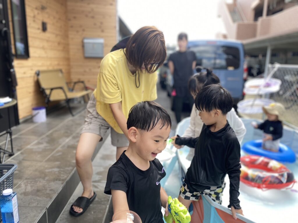 子どもたちは大はしゃぎで、ずぶ濡れ、プールの中で水鉄砲合戦! 「やばい、これ、めちゃくちゃ楽しんでるじゃん…」と親たちもテンションUP!